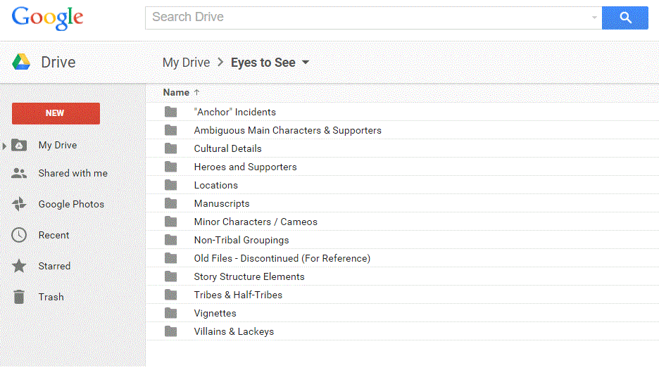 It is not without reason that I have been absent from this forum since October. I have resumed a project that had stymied me a few years ago. I figured out what was its problem: it could not be one novel. In fact, it has turned into four novels that cover essentially the same events from different points of view. As one might imagine, this is taking a very, very long time to work out in practical terms. The specific difficulty may be stated thus: in order to write any one of these books, one must know what happens in the other three– in short, the process for developing one story expands fourfold, because none of these characters goes to exactly the same places as the others, knows exactly the same set of people as the others, etc. At the same time, there is so much overlap that they must all be handled simultaneously. I have files… oh, I have files… I’ll show you level 1 of my files. If you want a sense of the scope of this project, just count the files in this screen shot, and multiply it by six.